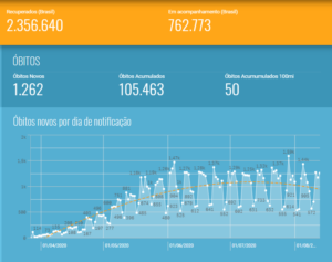 Em relação aos óbitos, o Brasil acumula 105.463 mortes por coronavírus. Nas últimas 24 horas foram mais 1.262. A maior parte aconteceu em outros períodos, mas tiveram conclusão das investigações com confirmações das causas apenas neste período.