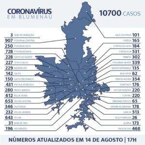 Foram mais 89 blumenauenses positivados nesta sexta-feira, elevando o acumulado para 10.700 desde o início da pandemia. Destes, 8.504 (79%) já passaram pelo período de isolamento e não apresentaram novos sintomas, considerados recuperados. Ainda têm 2.039 pessoas em isolamento domiciliar, monitoradas pela Secretaria de Saúde.