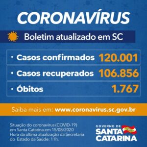 Santa Catarina já registrou 120.001 casos confirmados de infecção pelo novo coronavírus. Desses, 106.856 (89%) são considerados recuperados e 11.378 continuam em acompanhamento. A Covid-19 já matou 1.767 catarinenses. A taxa de letalidade atual é de 1,47%.