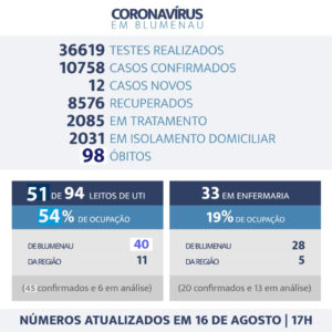 São 52 pessoas em UTI – 54% de ocupação dos leitos (51 de 94). Destes, 40 são de Blumenau e 11 moradores da região (45 confirmados e seis em análise). Já em enfermaria são 33, com ocupação de 19% dos leitos por 28 blumenauenses e cinco de cidade vizinhas — 20 confirmados e 13 em análise.