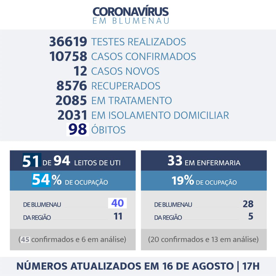 Blumenau registrou neste domingo, a confirmação de mais cinco óbitos em decorrência de coronavírus, somando um total de 98 desde o início da pandemia. As vítimas foram quatro homens e uma mulher. A morte de um dos homens ocorreu no sábado. Com 75 anos, estava internado desde 26 de julho. Os outros homens tinham 66, 69 e 71 anos. O primeiro estava internado desde o dia 04 de agosto. O segundo desde 02 de agosto e o terceiro desde 10 de agosto. A mulher tinha 76 anos, hospitalizada desde 02 de agosto. Todos estavam em UTI.