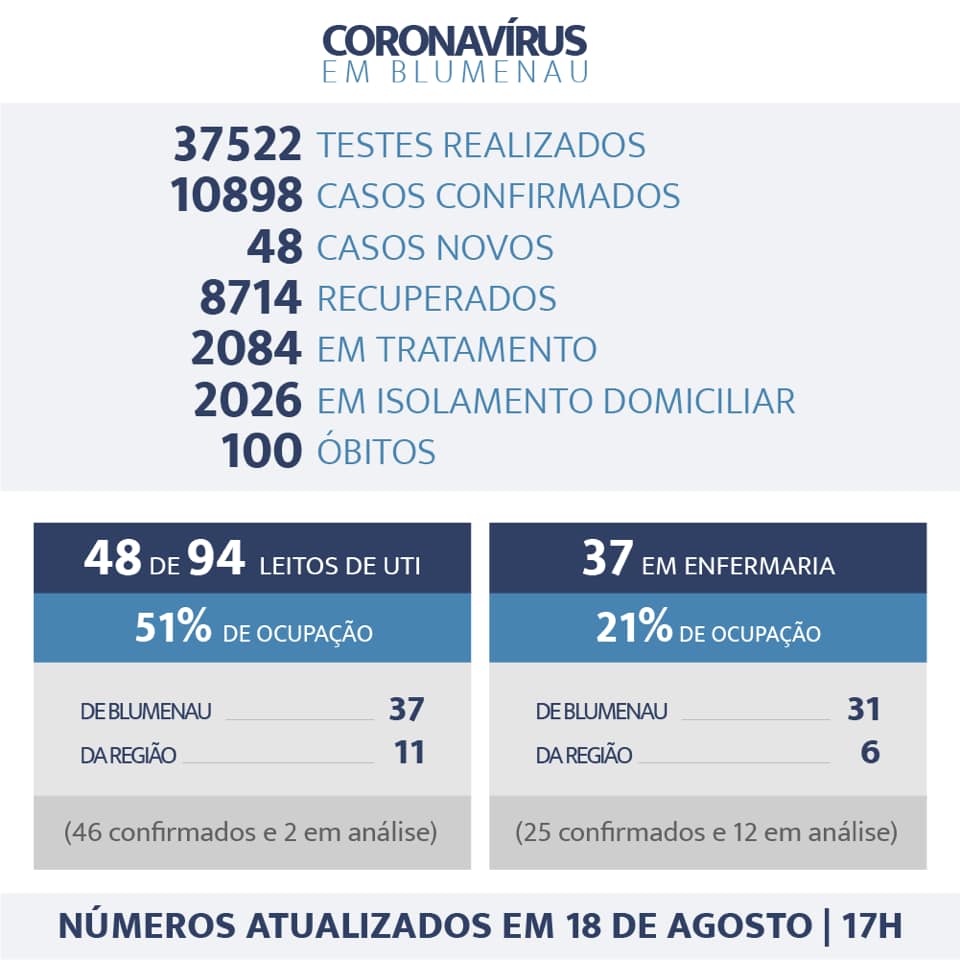 São 85 pessoas ainda internadas – 48 em UTI, onde a ocupação é de 51% (48 de 94 leitos). São 37 pacientes de Blumenau (36 confirmados e um em análise) e 11 pacientes da região (10 confirmados e um em análise).