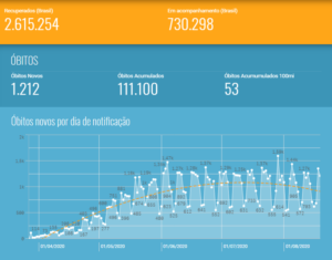 Em relação aos óbitos, o Brasil possui 111.100 mortes por coronavírus. Nas últimas 24 horas, foram registradas 1.212. A maior parte aconteceu em outros períodos, mas tiveram conclusão das investigações com confirmações das causas por Covid-19 apenas neste período. Assim, 279 óbitos, de fato, ocorreram nos últimos três dias. Outros 3.173 seguem em investigação.