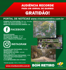 O Informativo VIVER BOM RETIRO aproveitou o período de pandemia para, literalmente, fazer do “limão uma limonada”. Por conta do grande alcance de suas notícias postadas em suas plataformas digitais (Portal e Redes Sociais), se consolidou como o principal canal de comunicação de bairro do Vale do Itajaí. Nos últimos 154 dias (desde 18 de março), as 594 notícias publicadas no portal de notícia www.viverbomretiro.com.br foram visualizadas 61.359 vezes.