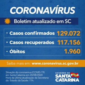 Santa Catarina acumula 29.072 pacientes com confirmação de infecção pelo novo coronavírus, mas 117.156 (91%) se recuperaram. Outros 9.956 estão em acompanhamento. O estado se aproxima de duas mil mortes. Até esta quinta, contabiliza 1.960 óbitos desde o início da pandemia. Esses números mantén a taxa de letalidade em 1,52%.