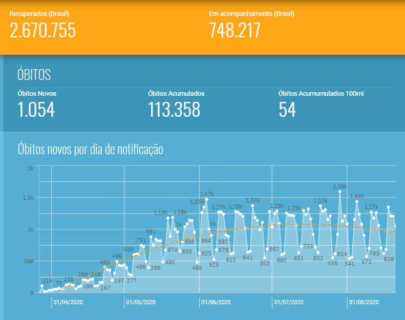 Em relação aos óbitos, o Brasil possui 113.358 mortes por coronavírus. Nas últimas 24 horas, foram mais 1.054 óbitos. A maior parte aconteceu em outros períodos, mas tiveram conclusão das investigações com confirmações das causas por Covid-19 apenas neste período. Assim, 374 óbitos, de fato, ocorreram nos últimos três dias. Outros 3.201 seguem em investigação.