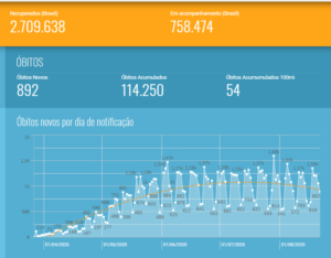 Em todo o Brasil, são 2.709.638 (75,6%) milhões de pessoas curadas do coronavírus a doença, contra 758.474 ainda em recuperação. Desde o início da pandemia 3.582.362 brasileiros foram contaminados pelo vírus – mais 50.032 registrados nos sistemas nacionais nas últimas 24 horas.