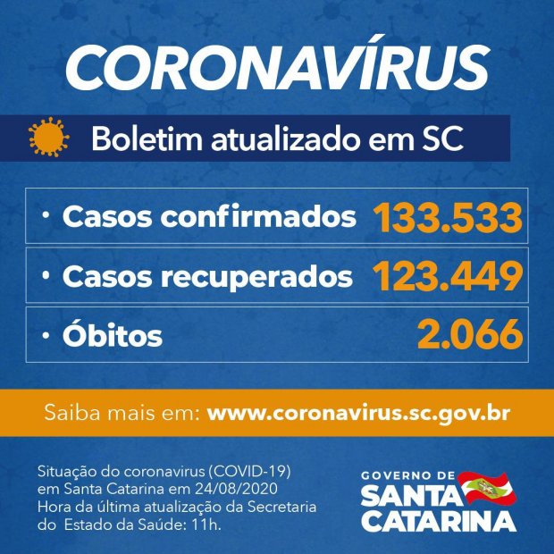 Santa Catarina acumula 133.533 pessoas com teste positivo para Covid-19, mas 123.449 (92%) se recuperaram. Outro 8.018 seguem em acompanhamento. Desde o início da pandemia, 2.066 catarinenses perderam a vida – uma taxa de letalidade é de 1,55%.