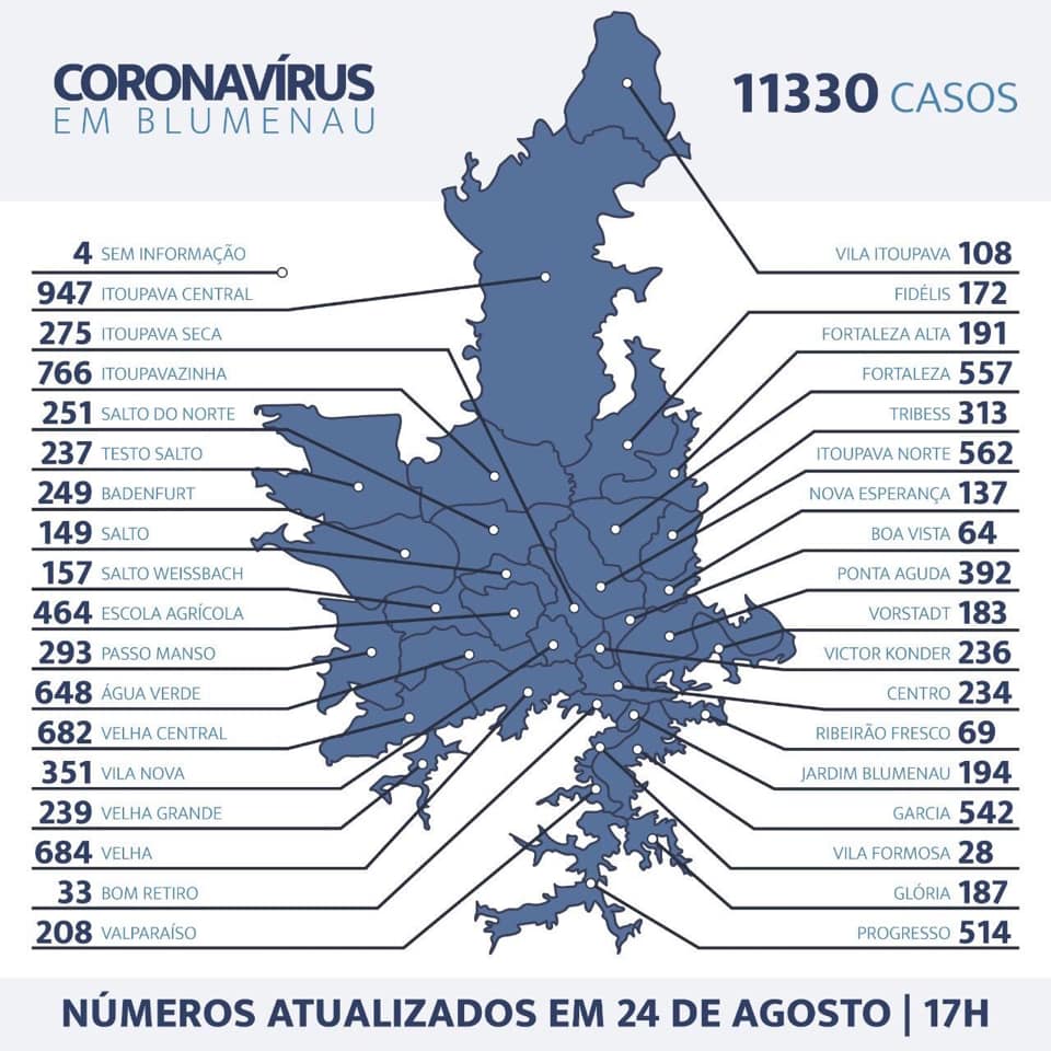 Blumenau registrou nesta segunda-feira, a confirmação de mais dois óbitos em decorrência do vírus, chegando a 112 no total. As vítimas eram uma mulher de 50 anos, falecida no último dia 20, mas com resultado positivo confirmado somente hoje. A segunda foi um homem de 63 anos, internado desde o dia 13 de agosto.