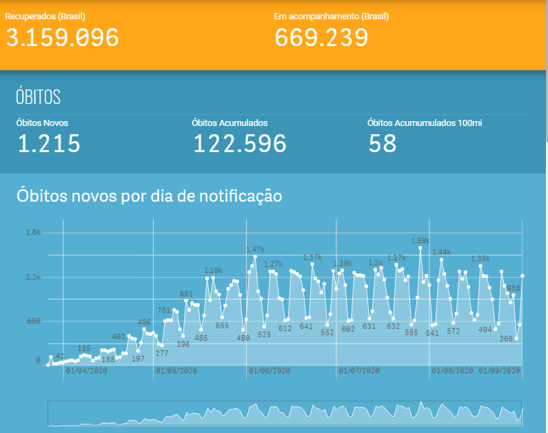 O Brasil contabiliza 3.159.096 (80%) pessoas curadas do coronavírus. O número de casos ativos soma 669.239. São os pacientes ainda em acompanhamento médico, internadas ou em isolamento domiciliar. No total, o país acumula 3.950.931 testados positivos. Foram mais 42.659 registrados nos sistemas nacionais nas últimas 24 horas.