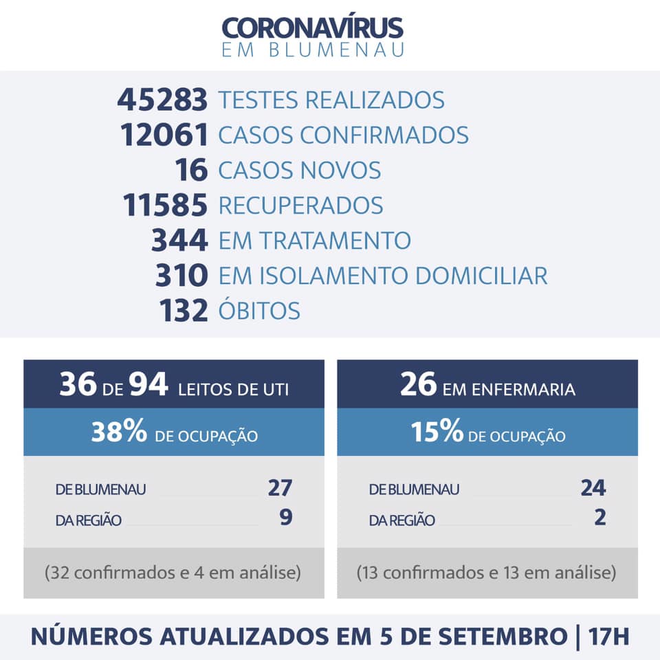 Neste sábado, Blumenau voltou a registro óbito após quase três dias de trégua. Soma agora 132 mortes desde o início da pandemia de coronavírus. A vítima foi uma mulher de 85 anos, internada desde o dia 27 de agosto. Durante a tarde a Prefeitura anunciou o óbito de um homem com 78 anos, internado em UTI desde o dia 27 de agosto. Porém, durante o trabalho de investigação da Vigilância Epidemiológica, feito em todos os óbitos, identificou-se que o paciente era morador de São João Batista. Por este motivo, a informação do óbito será corrigida e não contabilizada pela Prefeitura de Blumenau.