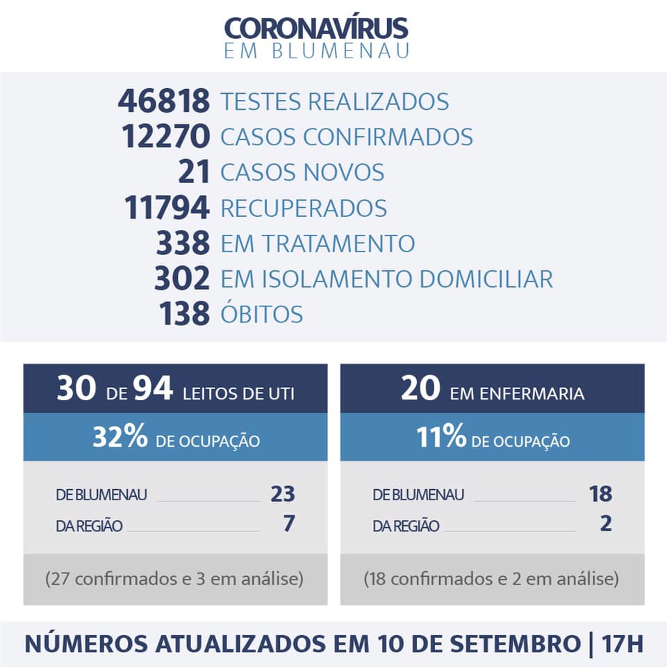 Dos 338 casos ainda positivos, 302 se recuperam em casa, onde são monitorados pela Secretaria de Saúde. Outros 50 pacientes estão internados, sendo 30 nas UTIs dos hospitais da cidade, com 32% dos 94 leitos ocupados por 23 moradores de Blumenau (20 confirmados e três em análise) e sete da região (todos confirmados).