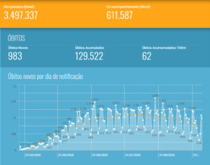 Em relação aos óbitos, o Brasil possui 129.522 mortes por coronavírus. Nas últimas 24 horas, foram registradas 983 mortes nos sistemas oficiais. A maior parte aconteceu em outros períodos, mas tiveram conclusão das investigações com confirmações das causas por Covid-19 apenas neste período. Assim, 307 óbitos, de fato, ocorreram nos últimos três dias. Outros 2.501 seguem em investigação.