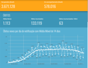 Em relação aos óbitos, o Brasil acumula 133.119 mortes. Nas últimas 24 horas foram mais 1.113. A maior parte aconteceu em outros períodos, mas tiveram conclusão das investigações com confirmações das causas por Covid-19 apenas neste período. Assim, 386 óbitos, de fato, ocorreram nos últimos três dias. Outros 2.445 seguem em investigação.