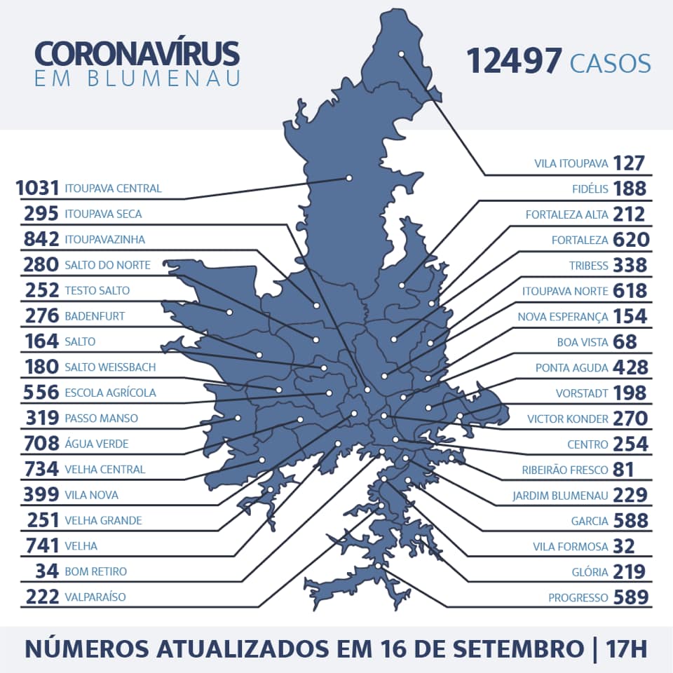 Dos 12.497 blumenauenses testados positivo para coronavírus, 12.043 (96%) estão curados. Na quarta-feira, mais 60 pessoas tiveram testes confirmados. O número de óbitos soma 146 após o registro de mais uma vítima: uma mulher de 81 anos. Ela estava internada em UTI desde o dia 6 de setembro e faleceu na noite desta terça-feira.