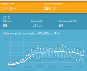O país alcançou a marca de 3.720.312 (84,2%) de brasileiros já recuperados do coronavírus, contra 564.665 ainda em recuperação. No acumulado, desde o início da pandemia, são 4.419.083 de casos confirmados pela doença – 36.820 registrados nos sistemas nacionais nas últimas 24 horas.