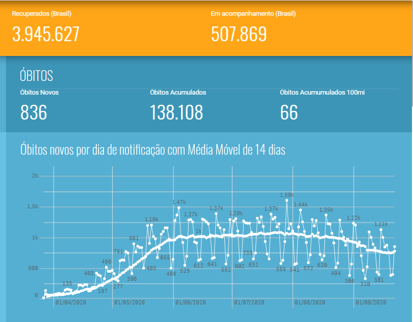 Em relação aos óbitos, o Brasil possui 138.108 mortes por coronavírus. Nas últimas 24 horas, foram registradas mais 836 nos sistemas oficiais. A maior parte aconteceu em outros períodos, mas tiveram conclusão das investigações, com confirmações das causas por Covid-19 apenas neste período. Assim, 401 óbitos, de fato, ocorreram nos últimos três dias. Outros 2.423 permanecem em investigação.