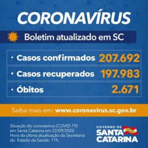 Santa Catarina acumula 207.692 casos confirmados de infecção pelo novo coronavírus, dos quais 197.983 (95%) estão recuperados e 7.038 permanecem em acompanhamento. O vírus já a morte de 2.671 catarinenses. A taxa de letalidade é de 1,29%.