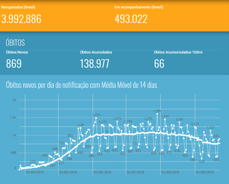 O Brasil tem 3.992.886 (86,3%) de pessoas curadas da Covid-19 de um total de 4.624.885 positivados acumulados desde o início da pandemia, quando surgiu o primeiro caso no país, no dia 26 de fevereiro. O número de casos ainda ativos é de 493.022 – mais 33.281 registrados nos sistemas nacionais nas últimas 24 horas.