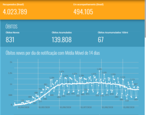 Em relação aos óbitos, temos 139.808 no total, com mais 831 nas últimas 24 horas. A maior parte aconteceu em outros períodos, mas tiveram conclusão das investigações com confirmações das causas por Covid-19 apenas neste período. Assim, 287 óbitos, de fato, ocorreram nos últimos três dias. Outros 2.422 permanecem em investigação.