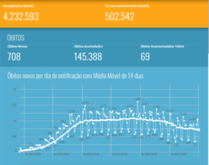 No acumulado, o país soma 4.880.523 positivados desde 26 de fevereiro, quando surgiu o primeiro positivado. Nas últimas 24 horas, mais 33.431 foram registrados nos sistemas nacionais. Em relação aos óbitos, temos 145.388 no total, sendo 708 nas últimas horas.