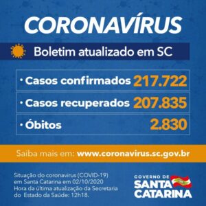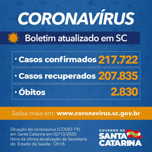 O Governo de Santa Catarina informou que há 217.722 pacientes com teste positivo para Covid-19, dos quais 207.835 (95%) estão recuperados e 7.057 permanecem em acompanhamento. Desde o início da pandemia, 2.830 óbitos foram causados pelo novo coronavírus. Esses números colocam a taxa de letalidade no estado em 1,3%.