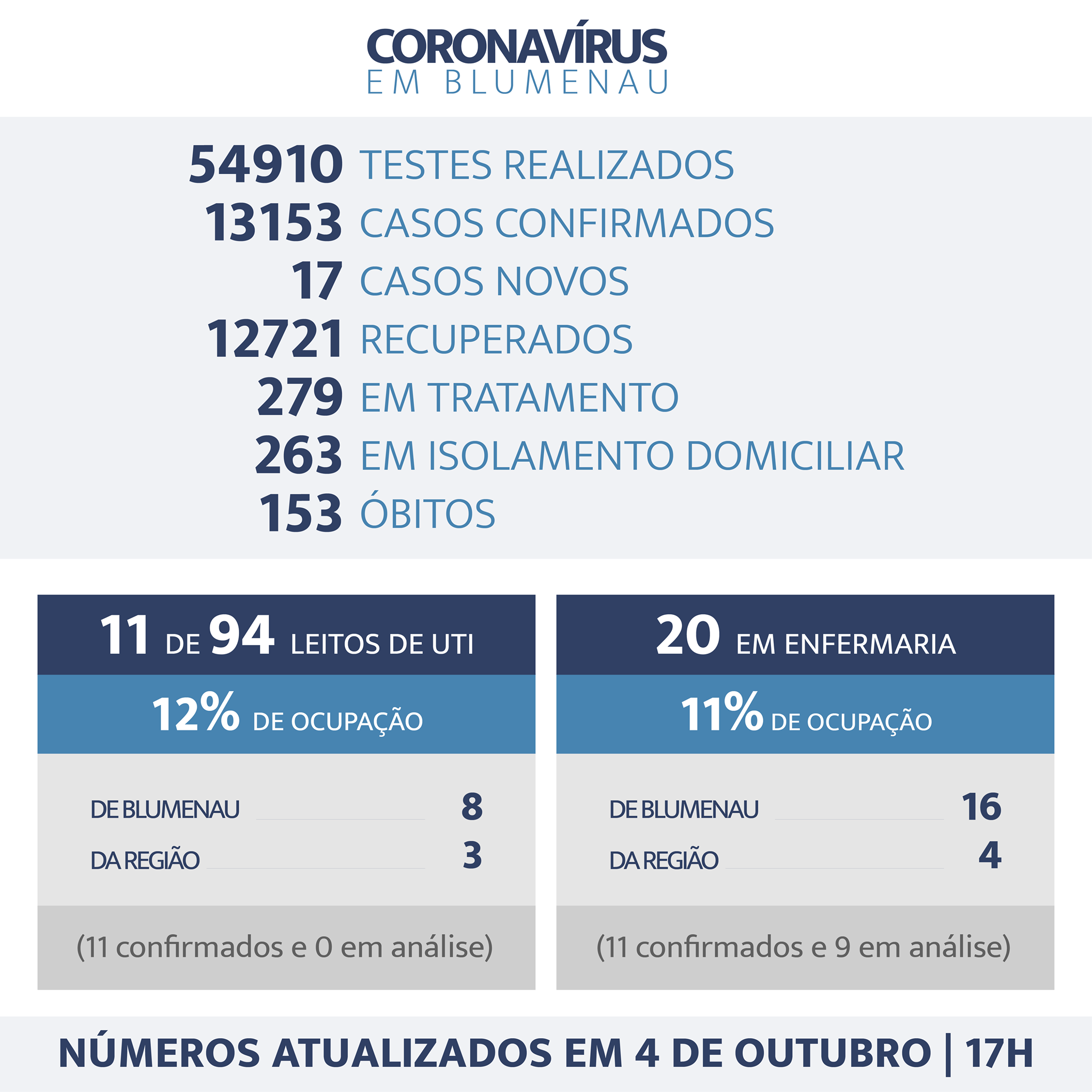 Blumenau registrou neste domingo, mais 17 moradores testados positivos, se juntando aos 13.153 diagnosticados desde o início da pandemia. Mas deste montante, 12.721 (97%) já passaram pelo período de isolamento e não apresentaram novos sintomas, considerados como recuperados. A cidade conta ainda com 153 óbitos em decorrência do vírus.