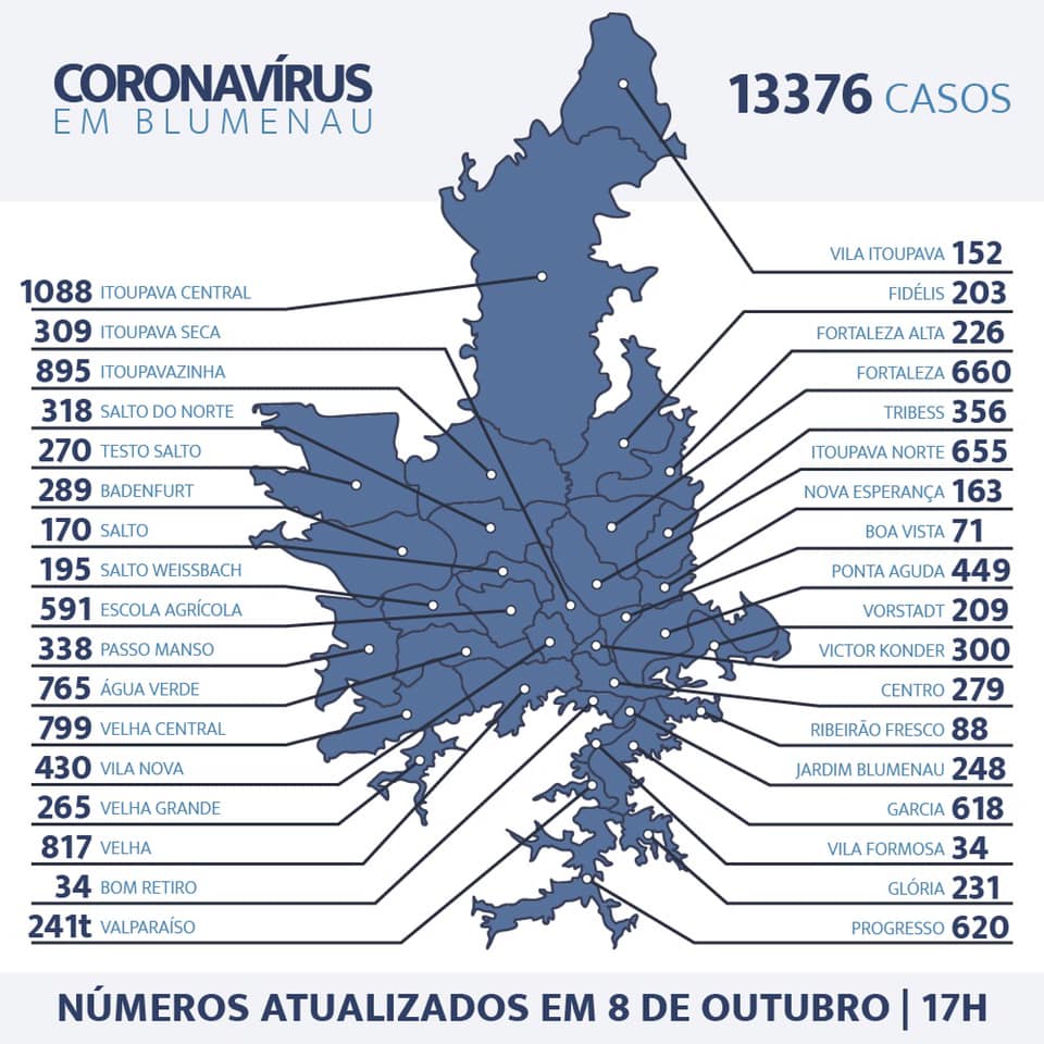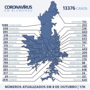 Blumenau registrou nesta quinta-feira, mais 78 moradores testados positivos com coronavírus. No total, a cidade soma 13.376 casos, mas 12.867 (96%) já passaram pelo período de isolamento, não apresentando novos sintomas e considerados recuperados. A cidade contabiliza ainda 153 vítimas em decorrência do vírus.