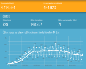 Neste momento, o Brasil possui 5.028.444 casos confirmados da doença – mais 27.750 registrados nos sistemas nacionais nas últimas 24 horas. Em relação aos óbitos, 148.957 brasileiros foram vitimados pelo vírus. Nas últimas 24 horas, foram mais 729 mortes. A maior parte aconteceu em outros períodos, mas tiveram conclusão das investigações com confirmações das causas por Covid-19 apenas neste período. Assim, 508 óbitos, de fato, ocorreram nos últimos três dias. Outros 2.346 permanecem em investigação.