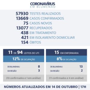 Blumenau registrou nesta quarta-feira mais 75 moradores testados positivos, totalizando agora, 13.669 casos confirmados de coronavírus (Covid-19) desde o início da pandemia. Mas deste total, 13.077 (96%) são considerados recuperados. A cidade registra ainda 154 óbitos decorrentes da doença.