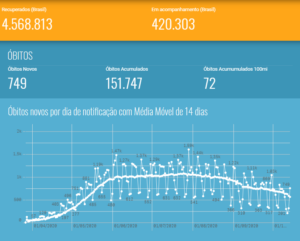Em relação aos óbitos, 151.747 foram vitimados pelo vírus. Nas últimas 24 horas foram mais 749, sendo que 385 ocorreram nos últimos três dias. Outros 2.388 permanecem em investigação.
