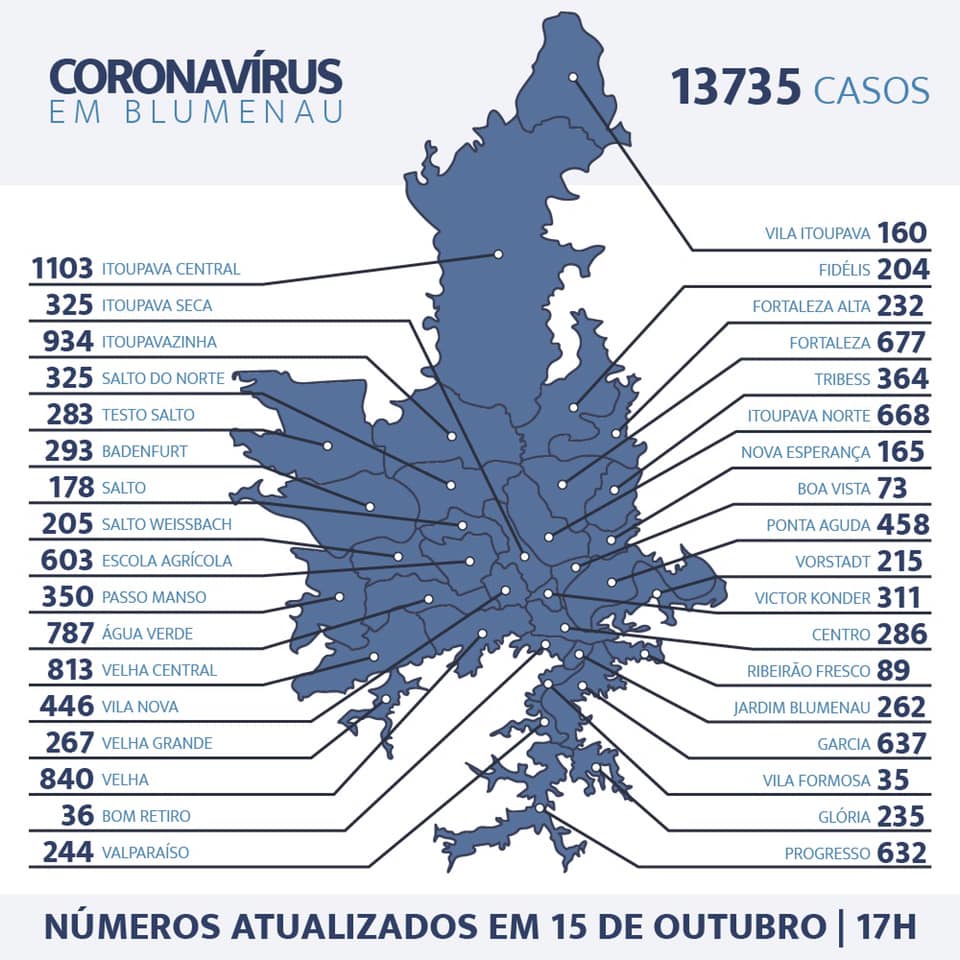 Blumenau registrou nesta sexta-feira a 155ª morte em decorrência do coronavírus. A vítima foi um homem de 60 anos, internado em UTI desde o dia 9 de setembro. No boletim de quinta-feira, a Prefeitura informou que mais 66 moradores foram testados positivos, totalizando agora 13.735 casos desde o início da pandemia.