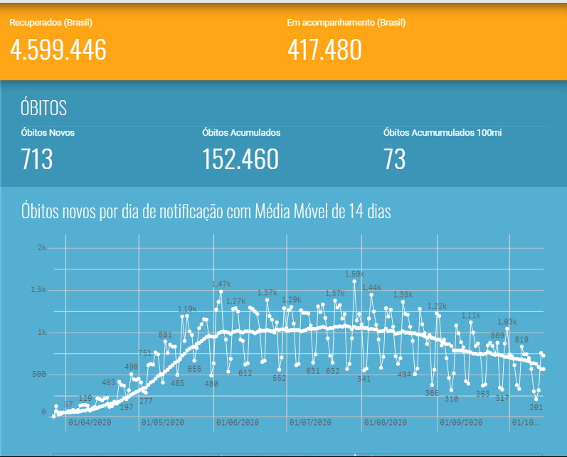 Até o momento, o país acumula 5.169.386 de casos confirmados da doença, sendo 28.523 registrados nos sistemas nacionais nas últimas 24 horas. Em relação aos óbitos, são 152.460 vítimas em decorrência do vírus. Nas últimas 24h, foram registrados 713 óbitos nos sistemas oficiais, sendo que 385 óbitos ocorreram nos últimos três dias. Outros 2.360 permanecem em investigação.