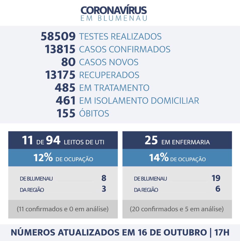 Nas UTIs dos hospitais da cidade, a ocupação é de 12% nos 94 leitos disponíveis, com 11 pessoas – oito de Blumenau e três da região. Todos confirmados. Já em enfermarias, 14% dos leitos estão ocupados, com 19 blumenauenses (16 confirmados e três em análise) e seis das cidades vizinhas (quatro confirmados e dois em análise).