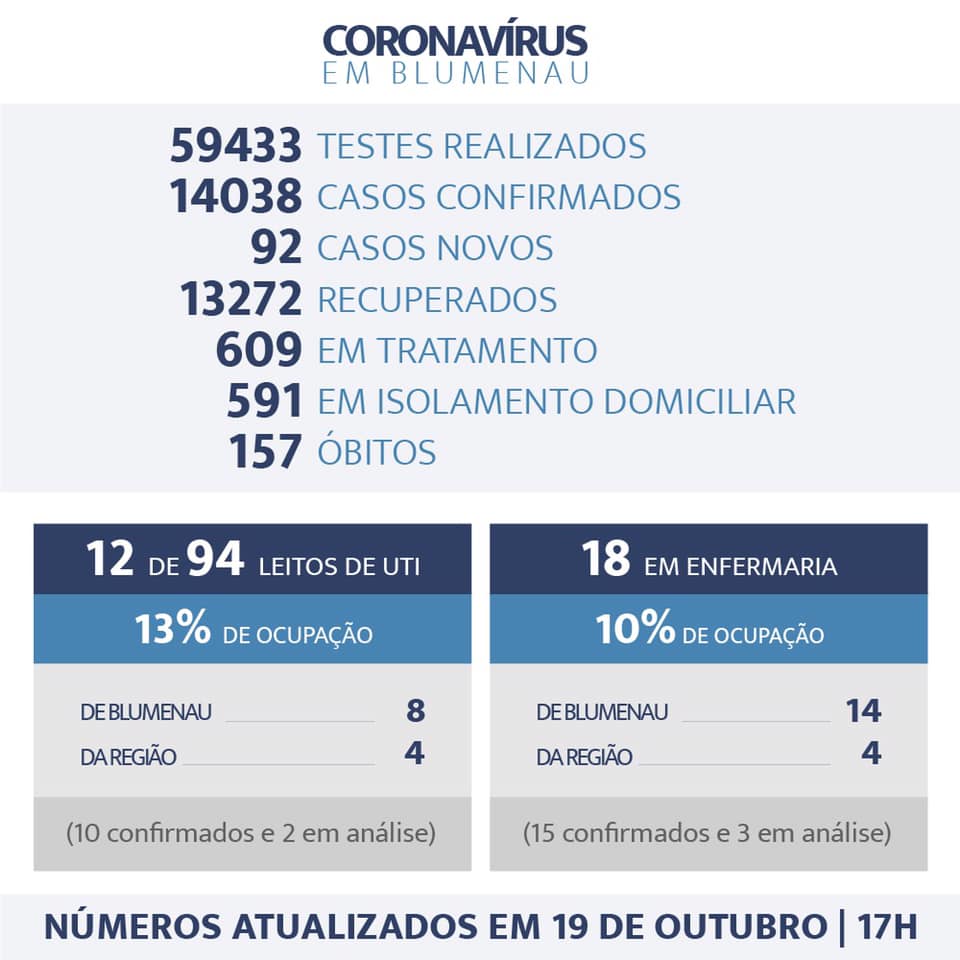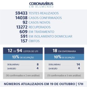 Nos 94 leitos de UTI dos hospitais da cidade, a ocupação é de 13% com 12 pessoas – oito moradores de Blumenau (sete confirmados e um em análise) e quatro da região (três confirmados e um em análise). Nas enfermarias, 10% dos leitos estão ocupados, 18 pacientes. São 14 blumenauenses (11 confirmados e três em análise) e quatro da região. Todos confirmados.