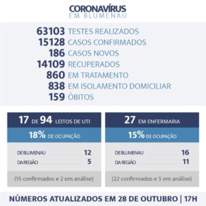 Dos 15.128 positivados em Blumenau, 14.109 (93%) estão recuperados. A cidade registra ainda 159 óbitos em decorrência do vírus. Dos 860 pacientes ainda em tratamento, 838 estão em isolamento domiciliar, monitorados pela Secretaria de Saúde.