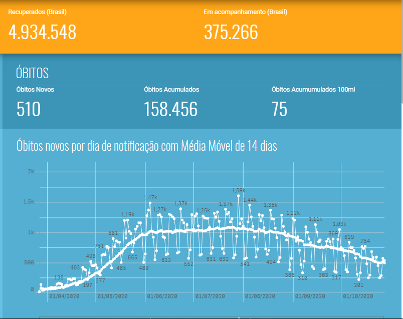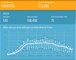 Em relação aos óbitos, são 158.456 brasileiros vitimados pelo coronavírus. Nas últimas 24 horas foram mais 510 mortes, sendo que 272 óbitos ocorreram nos últimos três dias. Outros 2.361 permanecem em investigação.