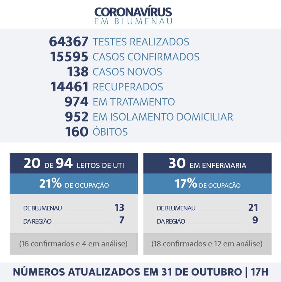 Blumenau registrou neste sábado, mais 138 moradores positivados, totalizando agora 15.595 casos confirmados de coronavírus. A 160ª vítima fatal da Covid-19 na cidade foi uma mulher de 64 anos. Ela faleceu na sexta-feira, mas a confirmação chegou somente neste sábado. Ela havia sido internada na UTI de um dos hospitais da cidade na quinta.