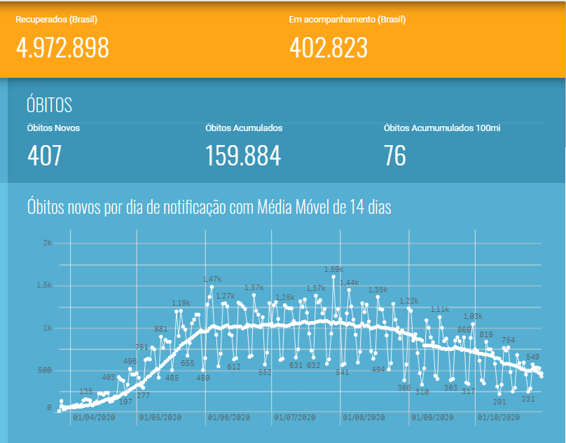 Desde 26 de fevereiro, quando foi diagnosticado o primeiro caso no país, 5.535.605 brasileiros foram testados positivos – mais 18.947 registrados nos sistemas nacionais nas últimas 24 horas. As mortes somam 159.884 – 407 registradas nos sistemas oficiais de sexta para sábado, sendo que 252 ocorreram nos últimos três dias. Outros 2.304 permanecem em investigação.
