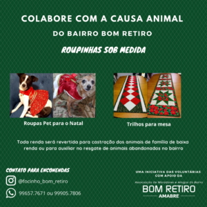 A confecção roupinhas sob medida para pets com temática de Natal e de trilhos de mesa vai auxiliar o bairro Bom Retiro com ações em favor da causa animal. A iniciativa pioneira partiu das voluntárias e protetoras Margarida Schneider e Fabiana Jensen. Elas também são integrantes da diretoria da Associação de Moradores e Amigos do Bairro Bom Retiro (Amabre) que prontamente abraçou o projeto.