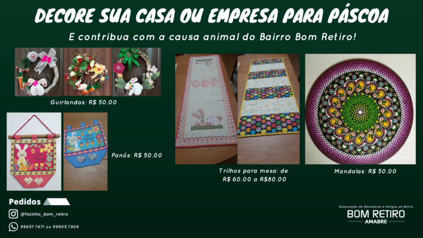 A ação em favor da causa animal no bairro Bom Retiro ganha força a cada dia. Ela iniciou em outubro do ano passado com a comercialização de trilhos de mesa, roupas para pets alusivas ao Natal e mandalas para decoração. Em nova etapa, a campanha tem a Páscoa como tema. Simultaneamente também foi iniciada a arrecadação de tampinhas plásticas em diversos pontos de coleta distribuídos pelo bairro. Com os recursos já arrecadados, nove pets do bairro já foram castrados.